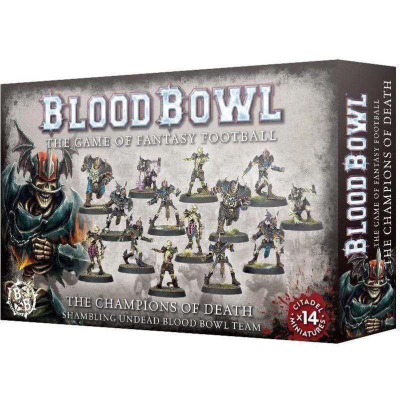 The Champions of Death team set contains 14 multipart plastic players covered in rusted armour, and eight thematic gaming accessories: