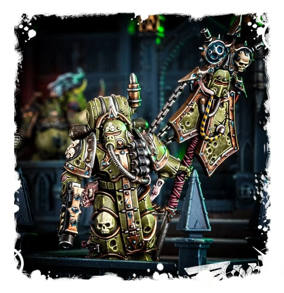 Sworn to Nurgle’s service, Plague Marines have disgusting, rotted bodies that stink of decay. The putrescent slime that oozes from their sores corrodes armour and boils away skin, yet despite their horrific disfigurements they are fearsome warriors indeed. Their rotting brains are inured to the agony of bodily corruption, making them all but immune to the pain or debilitation caused by battle wounds.