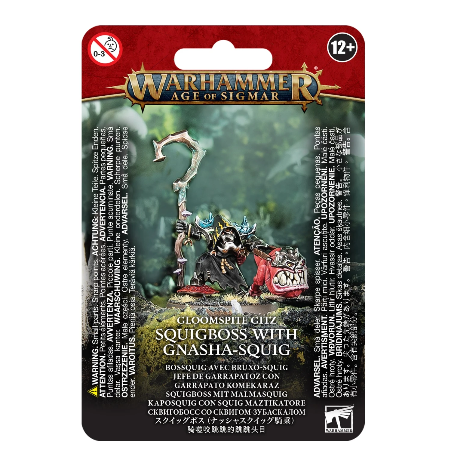 Veteran squig-herders who muster ravening packs of cave-beasts, Squigbosses don’t so much command their fungal herds as offer incentives of potent mushrooms, balanced by occasional jabbings from their squig-krooks. Most go to battle accompanied by loyal Gnasha-squigs, who gleefully chomp at anything that gets too close – this predatory pet is often their closest friend, for other grots find anyone that even a squig won’t eat to be deeply suspect.