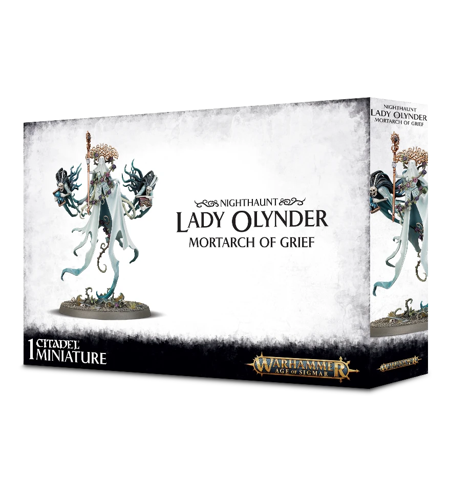 This multi-part plastic kit contains the components necessary to assemble Lady Olynder, Mortarch of Grief. As the Mortarch of Grief, she is surrounded by an aura of absolute misery – this miniature does an impressive job of capturing the bleakness. Hovering above the ground in her ghastly bridal dress and veil, little can actually be seen of her form other than the outline of a skull. Her bridal train, ruined and shredded, flows out behind her, with a wisp of this ethereal garment attaching the miniature to its base. Thorny vines of grave-roses, which sprout wherever she floats, wrap themselves around her waist and up to her headdress, which itself resembles a thorned briar. In her right hand she wields the Staff of Midnight, an ornate stave topped with a polished gemstone of vitrified grave-sand. She is accompanied by 2 macabre Banshee Handmaidens, horrifying skull-faced spectres. Each carries a gift – an ensorcelled grave-sand hourglass given by Nagash himself which can be smashed asunder with lethal effect, and a sealed casket, the contents of which are a mystery; hardly likely to be anything at all positive…